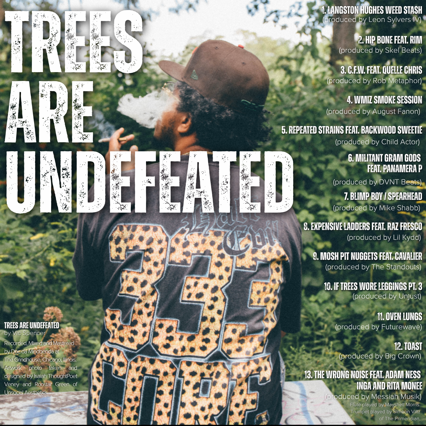 “In Trees Are Undefeated”, Vic Spencer positions himself not as a hero or martyr, but as part of a living system. He is a figure walking through shadows, carrying scars, some light, some burden. His path in rap is not meteoric, but arboreal, slower, root-growing, & depth-seeking. With production & features from Leon Sylvers, Skel Beats, Rob Metaphor, August Fanon, Child Actor, DVNT Beats, Mike Shabb, Lil Kydd, The Standouts, Unjust, Futurewave, Big Crown, Messiah Musik, Quelle Chris, Backwood Sweetie, Panamera P, Raz Fresco, Cavalier, Adam Ness, Inga, & Rita Moore Spencer seems more comfortable with fragility now more than ever & with projecting invincibility. Earlier work showed bravado, here? that bravado is tempered. He practices scars, not trophies. That makes him compelling..